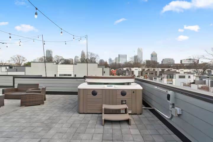 Stay at the Lux Townhouse, just minutes from Bank of America Stadium, Spectrum Arena, and Truist Field. Relax on the private rooftop with a hammock, grill, and fire pit. Inside, enjoy a stylish open living space, a fully equipped kitchen, and cozy bedrooms with private bathrooms. Perfect for a game, concert, or a weekend getaway!